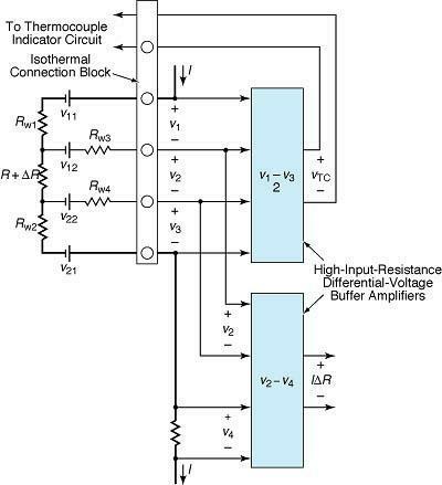 As indicated in the figure, the terminal voltages v1 through v4 are coupled to Anderson subtractors comprised of buffered differential level shifting amplifiers wired to implement these equations. The subtractor outputs are then the out put thermoelectric voltage vTC and resistance-change voltage IΔR.