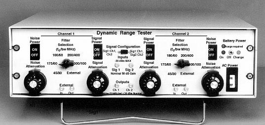 The dynamic range tester is useful for testing one- and two-input systems such as correlators or dual-channel receivers. It is used for testing systems that process signals close to and below the noise level. All signal inputs, outputs, and controls are accessed through the front panel, making the DRT easily configurable. Its design can be extended to other frequency ranges to create useful instrumentation for other applications, including telecommunications, telemetry, biomedical instrumentation, and others. Its design may also be miniaturized and enhanced with computer bus control. Control over the phase of the signals through the DRT may be added.