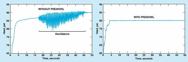 Experiments have shown that the oscillations occur within restricted ranges of net positive suction head (NPSH), speed, flow rate, and angle of incidence of flow on inducer blades. Thus, according to the present concept, one could suppress the oscillations by, for example, designing a jet pump to inject prewhirl to bring the angle of incidence out of the range for oscillation at a given NPSH. The figure illustrates the results of an experiment in which oscillations in a liquid-oxygen turbopump were suppressed in this way.