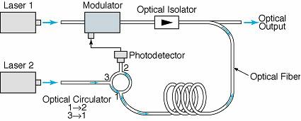 Initially, the signal applied to the modulator consists of noise, and thus the carrier signal is modulated initially by noise. However, the only part of the optical signal spectrum that becomes amplified is the component at the Brillouin-scattering frequency; this component gives rise to a beat signal in the photodetector output. The beat signal then drives the modulator to produce a stronger sideband at the beat frequency below the carrier frequency. Thus, through positive feedback, the beat signal (which constitutes the desired oscillation) becomes stronger until the gain saturates. The frequency of oscillation is given by