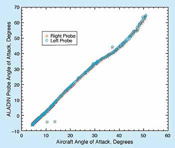 The in-flight performance of the fuselage-mounted probes (see Figure 1) for the ALADIN system was found to be excellent over the typical aircraft flight envelope, with accurate tracking of altitude, mach number, and angle of attack. The BFG ASD probes and algorithm were found to be effective over a range much greater than that of the standard F-18 airdata system. Figure 2 depicts a calibration curve of probe angle of attack vs. aircraft angle of attack, as an example of the high-angle-of-attack capabilities of the ALADIN system. The ALADIN system will provide aircraft flight-control systems with more information than was previously available, thereby creating a potential to make the aircraft both safer and more capable.