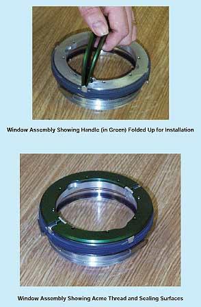 The windows can be installed and removed manually, without tools. Each window mates with a seat that is a permanent part of the chamber in which the window is to be installed. All one need do to install a window is to align it approximately with the seat, then rotate the window one turn. The rotation brings the window into alignment, brings sealing surfaces together to make a vacuum- or pressure-tight seal, and provides a vibration-proof connection. The window gives a firm feel when it becomes seated.