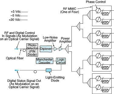 Among the submodules in each SLIC module (see Figure 2) are four highly integrated dual-channel RF MMICs, each of which contains two phase shifters that operate under 3-bit digital control, two analog attenuators, shift registers for transmission of control data for adjustment of phases, analog automatic gain control (AGC) circuits, and status-monitoring circuits. Digital control signals and an RF signal are fed to the SLIC module via a single photonic link. This combination of signals is detected by a positive/intrinsic/negative (PIN) diode in the module, then separated by other circuitry into control and RF components. The RF signal is amplified and split eight ways to feed the four dual-channel RF MMICs. A peak detector at the output terminal of each channel on each RF MMIC samples the output signal level; this level is compared with a commanded level in the corresponding AGC circuit, which adjusts the setting of an attenuator to maintain the channel output at the commanded level.