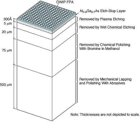 A QWIP FPA of the present type is fabricated on top of a 300-Å-thick layer of Al0.3Ga0.7As that, in turn, has been deposited on a relatively thick (several hundred µm) GaAs substrate. Then the thinned QWIP FPA is formed by removing the substrate from under the Al0.3Ga0.7As layer in the following sequence of processes: