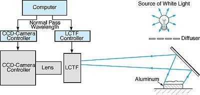 In experiments to demonstrate the technique, a band-pass liquid-crystal tunable filter (LCTF) and a 16-bit charge-coupled-device (CCD) camera (see Figure 1) were used to image chilled aluminum cells that were, variously, empty or filled with ice or water to various thicknesses. Reference images of a 99-percent-reflectance standard were also acquired. The aluminum, water, ice, and reflectance-standard images were acquired in 21 wavelength bands, each about 10 nm wide, at nominal pass wavelengths from 850 to 1,050 nm. An independent set of data for verification of the spectral images was acquired by use of a point spectrometer.