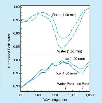 The spectral image data were corrected for CCD dark current and bias and converted to reflectance units, and regions of interest were chosen for determining the spatially averaged reflectance spectra. Some of the results are plotted in Figure 2, which illustrates how spectra can be used to distinguish between, and estimate thicknesses of, water and ice. The experiments revealed one shortcoming; namely, that specular reflection from the surface of interest can cause saturation in affected CCD pixels. Fortunately, saturated pixels can simply be excluded from processing of image data; this was done during the processing of image data in the experiments.