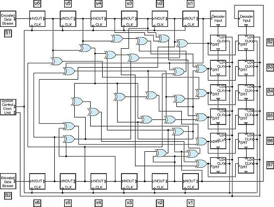 The algorithm is best described via the example illustrated in Figure 1, which shows the logic diagram of a coder/decoder pair that implements a binary convolutional code of length 7½. The encoder processes the input data stream into two encoded data streams. A notable property of convolutional encoding is that the initial state of the encoder determines the encoder outputs. In this case, there are 26 possible initial states, and it is therefore reasonable to assume that an input data stream could be mapped to any one of as many as 26 unique pairs of encoded data streams. In a typical application, the encoder registers are preloaded with some known bit pattern to restrict the encoder to one of the 26 possibilities. The algorithm is based on the discovery that the pattern used to initialize the decoder can be calculated in real-time from the encoded data. The two encoded data streams are fed to two input terminals of the decoder, which processes these streams to produce two output streams. Provided that the decoder is initialized by use of the same bit pattern that was preloaded into the decoder, both output bit streams are forced to remain the same during the first six decoder shift cycles. Thereafter, if the decoder has been initialized correctly, both output streams should continue to be identical and to contain the original data in uncoded form. If the decoder has not been initialized correctly, then typically the decoder output bit streams begin to differ.
