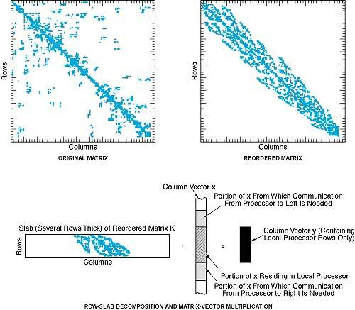 The chosen decomposition is of a row-slab type. The figure illustrates aspects of the row-slab decomposition for an example problem. The top left part of the figure shows the original structure of the sparse matrix. The top right part of the figure shows the structure of the matrix as reordered for minimum bandwidth in preparation for the row-slab decomposition and the resulting matrix·vector multiplication Kx = y. Each processor handles one slab. Because of the minimum-bandwidth reordering, the minimum and maximum column indices of each slab are known. If the row indices of that piece of the dense vector x that is local to this processor contain the range from the minimum to the maximum column index for this slab, then the multiplication can be done purely locally, and the corresponding part of the product vector y will be purely local. In general, the column indices range beyond the local row indices; this gives rise to a need for a communication step to obtain the adjacent portions of x that are not local to this processor. This communication step involves data from a few processors to the left and right. The number of processors communicating data depends on the row bandwidth of the slab and the number of processors in use. Overall, the row-slab decomposition strikes a balance among (1) nearly perfect balance of data and computational load among processors, (2) minimal albeit suboptimal communication of data in the matrix·vector multiplication, and (3) scalability to larger problems on greater numbers of processors.
