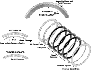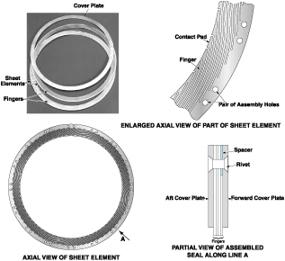 Another key feature is a series of pairs of holes, into which rivets are inserted during assembly of the seal. The holes are spaced such that when successive elements are alternately indexed to the holes, the empty spaces between the finger/ pad subelements of each sheet element are covered by finger/pad subelements of the adjacent sheet element. Usually, a first-generation finger seal comprises four sheet elements, a spacer on the forward (high-pressure) side, and forward and aft cover plates.