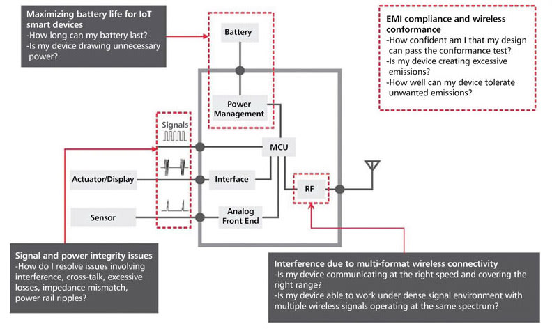 Challenge 4. Electromagnetic interference (EMI) issues must be identified and dealt with early in the design process to ensure electromagnetic compatibility (EMC) compliance. EMI can be especially problematic in scenarios where large numbers of IoT devices operate simultaneously near one other. Avoiding EMI requires designers to not create unwanted emissions in their designs, and to ensure those designs remain robust against unwanted emissions.