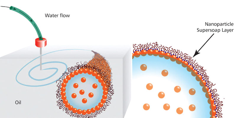 In practice, soon after the water is injected into the oil, dozens of ligands in the oil attach to individual nanoparticles in the water, forming a nanoparticle supersoap. These supersoaps jam together and vitrify, like glass, which stabilizes the interface between oil and water and locks the liquid structures in position. This stability means that the water can be stretched into a tube, and it remains a tube. The water also can be shaped into an ellipsoid, and it remains an ellipsoid.