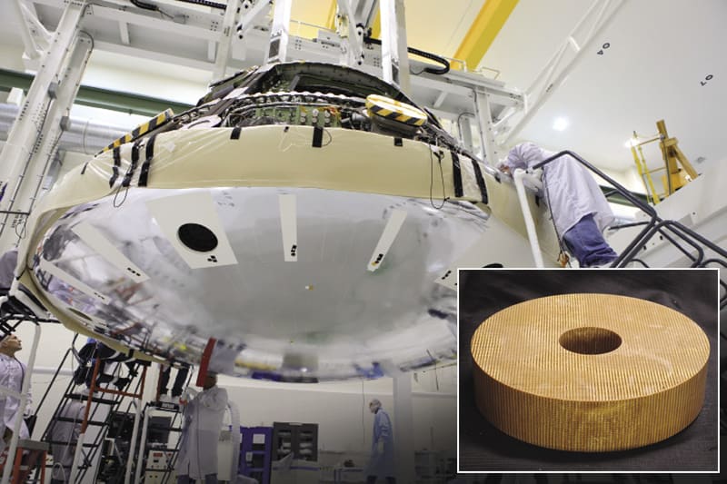 One spot on Orion’s heat shield proved particularly challenging for the engineers designing it: it needed to be not only a great insulator but also structurally strong. “Most of the heat shield is a kind of low-density material that’s very good at insulating the heat. That’s the main thing it has to do, but it’s not a very strong material,” explains materials engineer Jay Feldman, technical lead for the 3D Multifunctional Ablative Thermal Protection System (3D-MAT) at NASA’s Ames Research Center.