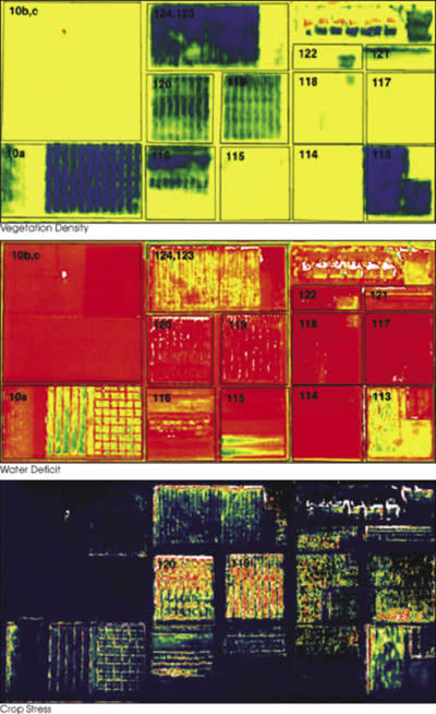 Health can be determined by the amount of infrared energy reflected relative to reflected visible light, Orrey says, explaining that healthy crops reflect more infrared light to keep cool.
