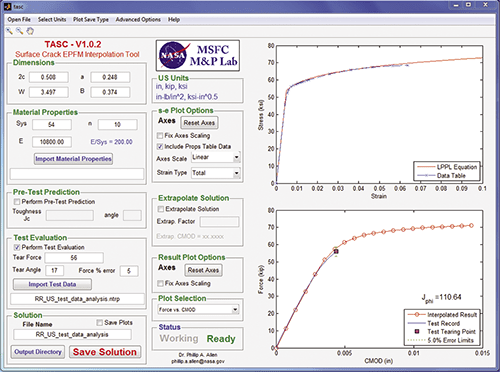 In recognition of his work, Allen was one of two recipients of NASA’s prestigious Software of the Year Award for 2014. Right now he’s working toward what could be another success story: getting TASC designated as an official standard analysis tool for surface crack testing. “It will be the first ASTM mechanical testing standard that uses a computerized tool to get the answer. That would be cool.”
