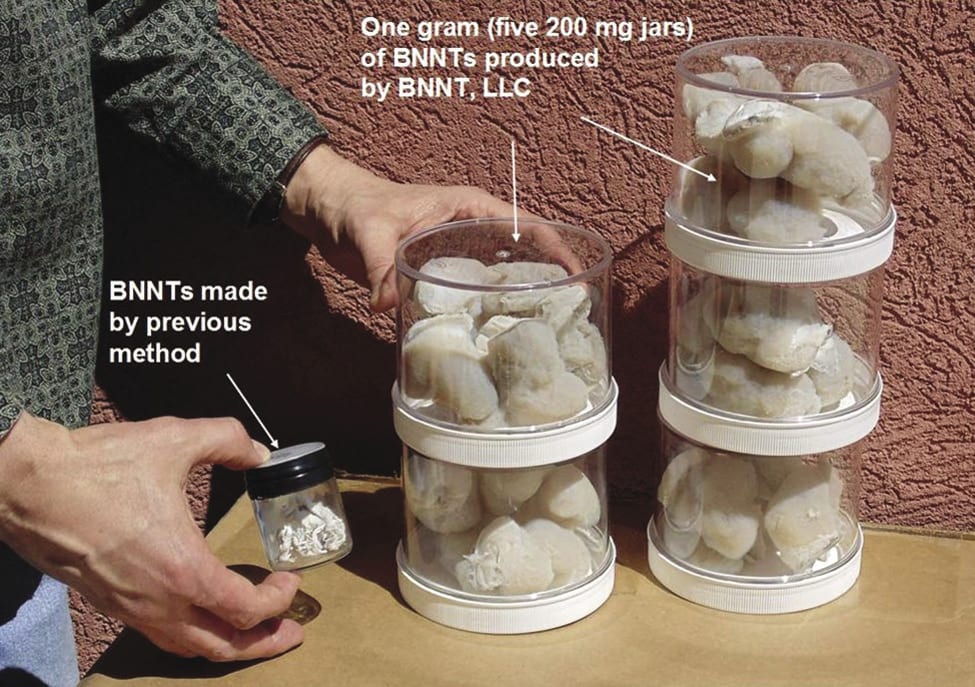 Having licensed NASA’s patents, BNNT LLC’s goal has been to continue improving the nanotube’s production efficiency. As a result, in May 2014, the company announced it had further developed the foundational technology to the point that 200 milligrams of BNNT could be synthesized per hour. That July, the product was made commercially available to researchers for the first time.