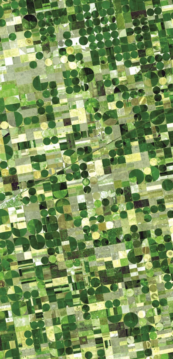 The images can also reveal mistakes and problems that could be fixed in the future. Showing a shot of another field, he points out that the dark circle of vegetation fed by the farmer’s pivot irrigation system is streaked with rings of yellow, indicating a problem with the sprinkler heads. “Anything linear, straight, or in a pivot is human error,” he says. “Whenever we see a field that’s not uniform, it means there are problems. Some of them you can manage, some of them you can’t.”