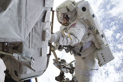 Enter all that stands between an astronaut and such a bleak prognosis: the spacesuit. Also called an Extravehicular Mobility Unit, or EMU, the spacesuit is a convergence of technologies designed to provide a breathable and otherwise livable temporary microclimate. Because of the sometimes hours-long projects undertaken outside the spacecraft, there’s even a “drink bag” for when thirst calls, and an extra-absorbent undergarment for when nature does.
