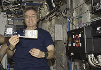 The answer was yes. When Feighery realized that the Johnson Microbiology Lab had designed an alternative procedure that functioned nearly as well as the standard one, he worked across organizational lines to get the system certified for flight. “We did a lot of testing to show you could do these tests at lower temperatures and without containers and still make them work,” says Feighery. To put it simply, a water sample, mixed with the growth indicator powder, is stored in a plastic bag and left out at room temperature for approximately 44 hours, at which time a dependable reading can be made.