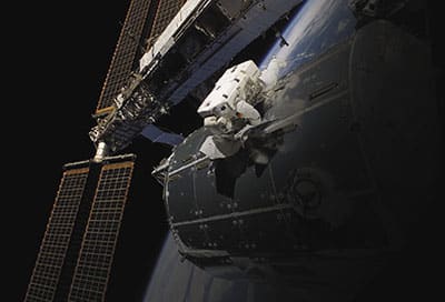 European Space Agency astronaut Hans Schlegel works on the Columbus module of the International Space Station (ISS) during STS-122. Columbus is a science laboratory that has housed many experiments on the ISS, including research into how micro-organisms react to and grow in the microgravity environment.