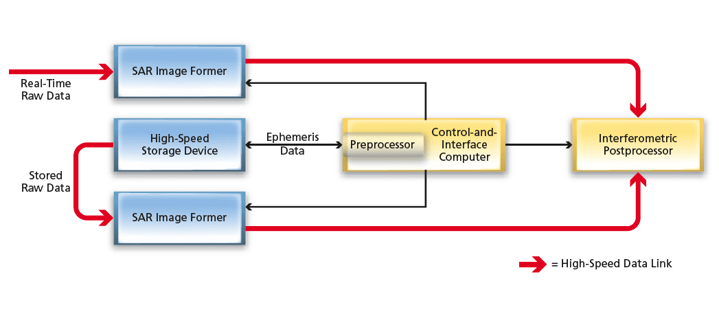 - Interferometric Postprocessor — Another microprocessor generates SAR interferometric image data from the outputs of the two SAR processors. In a typical application, the output of this processor would be transmitted to a ground station (downlinked). Because all of the processing up to the point of downlinking would be done onboard, the downlink data rate necessary for observing changes in the terrain would be significantly reduced.