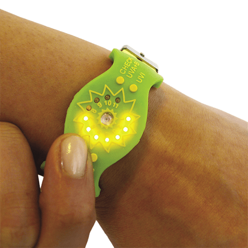 To use SunFriend, a user first selects his or her level of skin sensitivity on an 11-point scale, with 1 indicating the highest level of sensitivity and 11 the lowest, reserved for very dark or sun-tolerant skin types. The device is then worn face-up on the wrist and left uncovered.