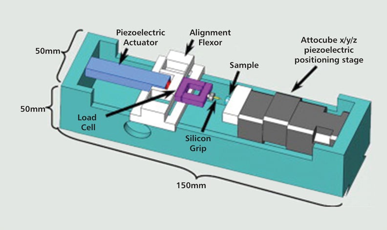 The device incorporates a high-precision piezoelectric actuator; a high-precision inertial force positioning stage; a small, low-profile load cell; and a variety of highly compliant contact platens and grips that can be manufactured from a SiC or similar compliant fiber.