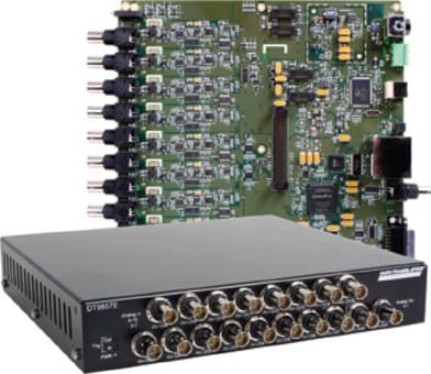 Measurement Computing Corp., Norton, MA, offers the DT9857E dynamic signal acquisition module for noise, vibration, and acoustic measurements. Eight or 16 24-bit IEPE (ICP®) sensor inputs are synchronized with a tachometer input, two measurement counters, and a general-purpose counter/timer to provide data streams that are matched in time, for field or laboratory use. Two stimulus D/A outputs, each of 32-bit resolution, and an 8-bit digital output port are available for dynamic waveform generation and control.