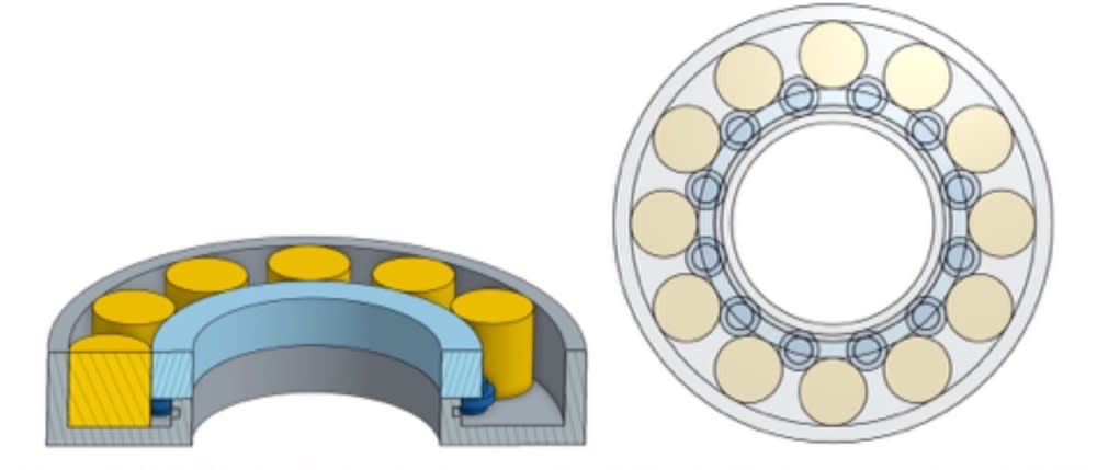 A cageless bearing with rolling separator elements was developed for applications including portable medical devices, toys, and robotic applications with medium force requirements. The normal cageless bearing has added rolling separator elements to overcome friction issues.