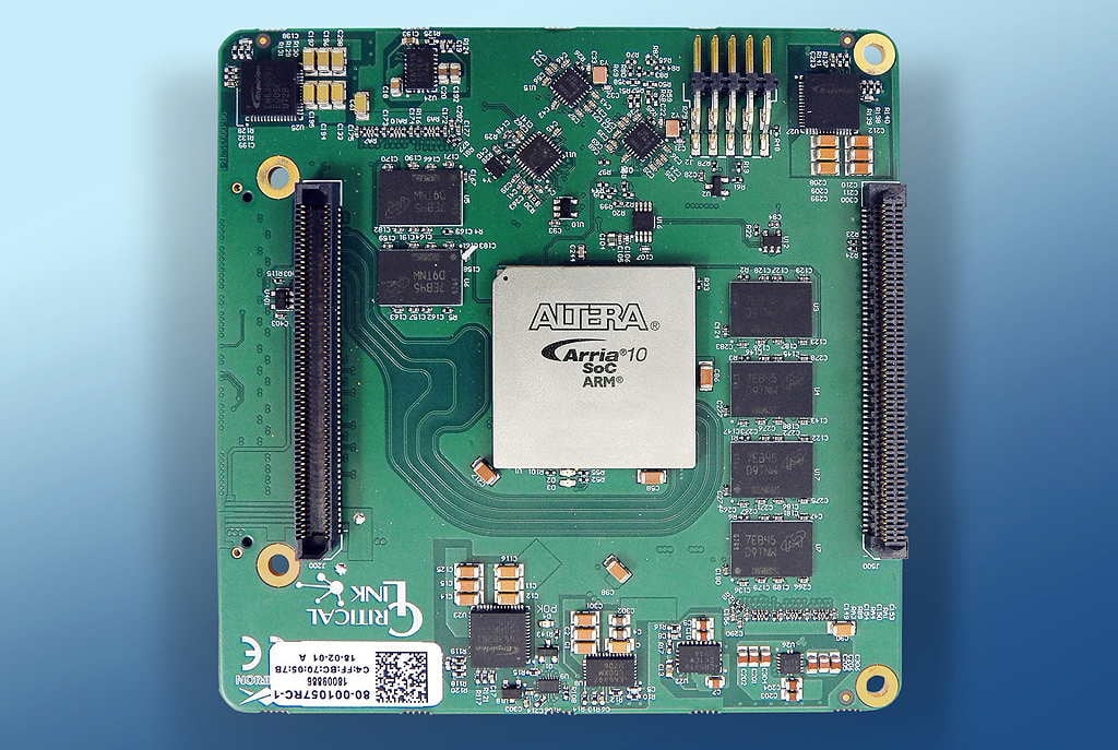 Critical Link, LLC (Syracuse, NY) introduced the MitySOM-A10S-DSC processor board for the next generation of embedded imaging applications. The new board features dual-side connectors for stack-through configurations. It is a highly-configurable system-on-module (SoM) featuring the Intel®/Altera Arria® 10 SoC with dual core ARM and up to 480KLE FPGA fabric. The module includes on-board power supplies, two DDR4 RAM memory subsystems, and a rich set of user interfaces. The A10 board supports both OpenCL™ and high-level synthesis (HLS) tools for accelerating design cycles and targeting C/C++ code to the FPGA.