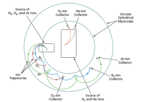 The other source has two holes — one for H2 and one for He ions. In the presence of the magnetic field, this source is sufficiently mass-selective that the circular cycloidal mass analyzer is not needed for detecting H2 and He ions. Therefore, this source is placed, along with collectors facing its two exit holes, within the inner cylindrical electrode, where there is no applied electric field but the applied magnetic field is present. Hence, the combination of this source and its two collectors is characterized as a mass analyzer within a mass analyzer.