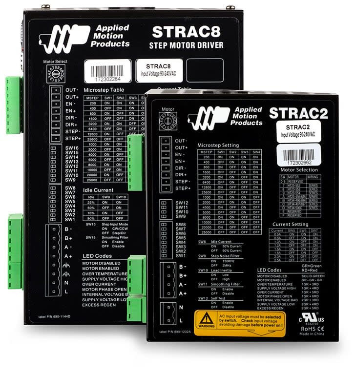 Applied Motion Products (Watsonville, CA) announced AC-powered STR (STRAC) stepper drives for industrial applications powered by AC supply voltages. The drives feature advanced microstepping performance and current control with anti-resonance that improves motor smoothness and torque over a wide speed range. Units operate on AC supply voltages of 90 to 240 VAC and wire directly to 120 or 220 VAC line voltages to eliminate DC power supply requirements. The drives internally convert AC line voltages to high DC bus voltages to drive large step motors at maximum power. Available in two models, the STRAC2 drives provide up to 2.2 A/phase while the STRAC8 provides up to 8.0 A/phase. Each drive operates in step and direction or pulse/pulse control mode. Each drive microsteps to 25,000 steps/rev with a 1.8° step motor (1/125 step) even when command pulses are low-resolution. Users can set up drive parameters — including motor selection, current, and step resolution — using dip or rotary switches; no software is required.