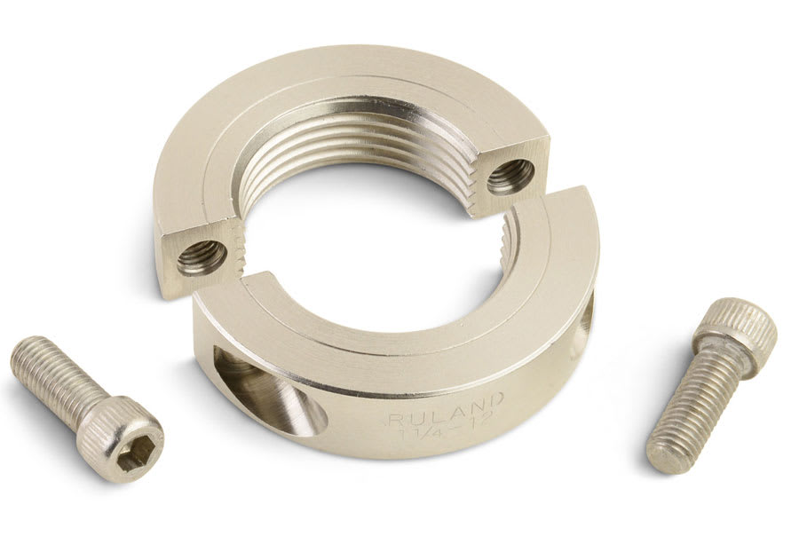 Ruland (Marlborough, MA) offers inch and metric left-hand threaded shaft collars available in one- and two-piece clamp styles in steel and stainless steel with bore sizes ranging from 1/8 to 2-1/4" and 4 to 30 mm. Left-hand threaded shafting is used to reduce the risk of components coming loose in rotating applications and as a safety measure to prevent the unintended removal of critical components. Threaded shaft collars are suited for guiding, spacing, stopping, mounting, and component alignment in industries such as packaging, printing, semiconductor, and solar. The two-piece type allows for installation or disassembly without the need to remove adjacent components. Threads are double-tapped for a burr-free finish. The units offer controlled face-to-bore perpendicularity (TIR ≤0.002" or 0.05 mm) when used as a load-bearing face or for aligning components such as bearings or gears. The collars are manufactured from 1215 lead-free steel with a proprietary black oxide finish and 303 stainless steel with hardware of like material.