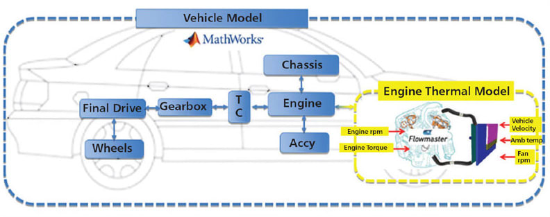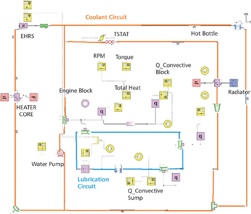 This engine thermal model was imposed with various boundary conditions such as vehicle speed, engine torque, and engine RPM vs. time from a larger vehicle simulation model. Because this is a transient thermal model, these boundary conditions are a trace of time for a particular drive cycle. The engine speed and brake torque were used by the engine thermal model to look up the instantaneous combustion heat, frictional heat, coolant, and oil flow rates and to then calculate the temperatures in various subsystems. The key outputs of the model were the transient temperatures of the coolant and engine oil, in addition to the thermal performance of individual components such as the radiator, engine oil cooler, etc.