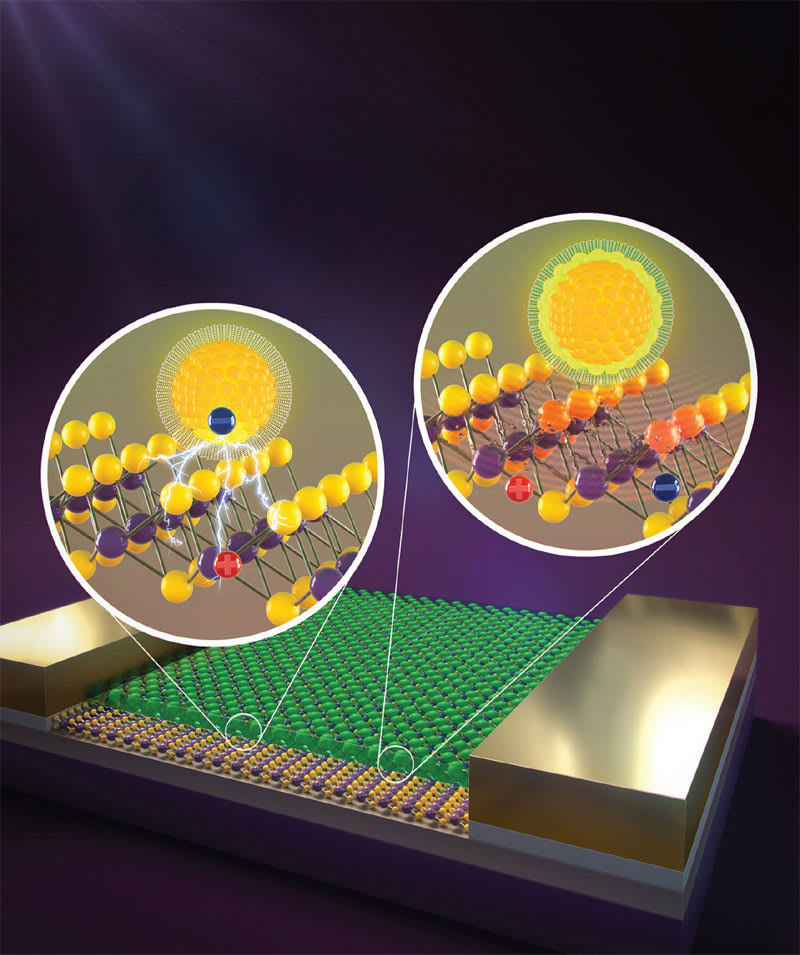In this work, atomically thin molybdenum disulfide was combined with quantum dots. Molybdenum disulfide is one of the transition-metal dichalco-genides — semiconducting compounds with a transition-metal (in this case, molybdenum) layer sandwiched between two thin layers of a chalcogen element (in this case, sulfur). To control the interfacial interactions, two kinds of quantum dots were designed: one with a composition that favors charge transfer, and the other with a composition that favors energy transfer.