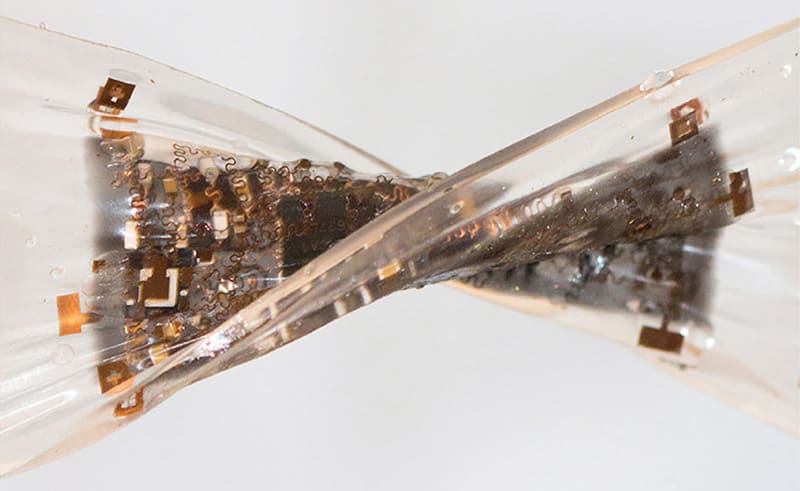 By stacking and connecting layers of stretchable circuits on top of one another, soft, pliable 3D stretchable electronics were fabricated that can pack a lot of functions while staying thin and small in size.