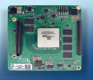 The MitySOM-A10S-DSC processor board from Critical Link, Syracuse, NY, features dual-side connectors for stack-through configurations. The configurable system-on-module (SoM) features the Intel®/Altera Arria® 10 SoC with dual-core ARM and up to 480KLE FPGA fabric. The module includes onboard power supplies, two DDR4 RAM memory subsystems, and supports both OpenCL™ and high-level synthesis (HLS) tools for targeting C/C++ code to the FPGA.