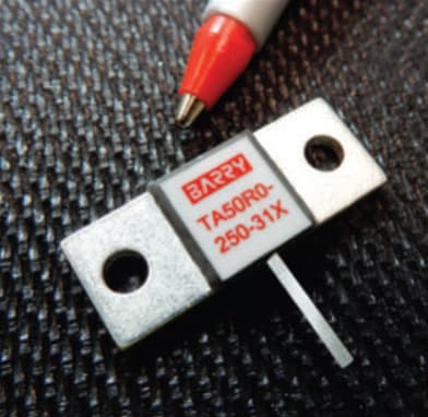 Barry Industries, Attleboro, MA, introduced the T50R0-250-31X RoHS-compliant flange mount RF termination for 5800-MHz industrial, scientific, and medical applications. It dissipates 250W with 21-dB guaranteed minimum return loss from 5600 to 6100 MHz. The thick film on the aluminum nitride termination can be used up to 15 GHz while still exhibiting favorable return loss. The flange and input tab are constructed of silver-plated copper, and overall footprint is 0.975 × 0.375” (24.77 × 9.53 mm).