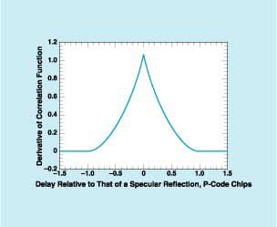 One function of particular importance for the mathematical foundation of the technique is the derivative of the correlation function (DCF) with respect to the model time delay. This function exhibits a sharp peak (see figure), the shape of which is affected in known ways by the wind speed and by surface- roughness statistics. Hence, in principle, one should be able to extract important sea-state parameters from the DCF. These parameters are, specifically, (1) the mean sea height (derived from knowledge of the location of the DCF peak relative to the model delay), (2) the ocean-surface wind (derived from the height of the DCF peak), and (3) the significant wave height (derived from the width of the DCF).