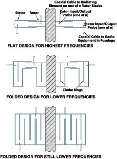 The rotor part of the rotary coupling would also contain n probes at equal angular intervals. A coaxial cable would couple radiation between each of these probes and the radiating element in or on one of the rotor blades. As the rotor turned, the rotor probes would pass through the stationary n-fold symmetric waveguide mode. This would cause the radio-frequency power coupled between each rotor-blade radiating element and the stationary radio equipment to vary with the instantaneous angle of rotation, so that the radiation pattern traced out by each radiating element alone during one complete rotation would exhibit n-fold symmetry. However, because there would be n blades, this pattern would be spatially modulated with another n-fold symmetry characteristic of the spatial relationships among the n radiating elements. A basic theoretical analysis shows that the net effect of the rotating and stationary n-fold symmetries would be to produce a predominantly azimuthally symmetric (non-rotating) far-field radiation pattern.