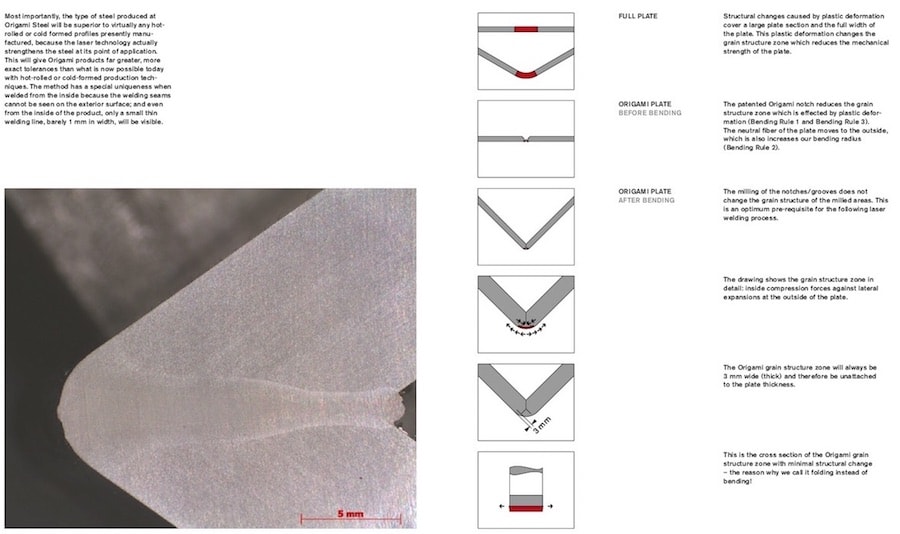 Origami Steel is a patented, cost-efficient structural steel fabrication technology that replaces hot rolled structural steel commodity products and profiles with hot rolled steel coil or plate that can be formed into virtually any shape. Origami structural steel elements are available in a much wider product selection that includes multiple sizes, shapes, steel grades, and lengths. Applications include structural steel, car/truck chassis and lightweight vehicles, sea walls and flood protection, and just-in-time delivery of buildings of all shapes and sizes.