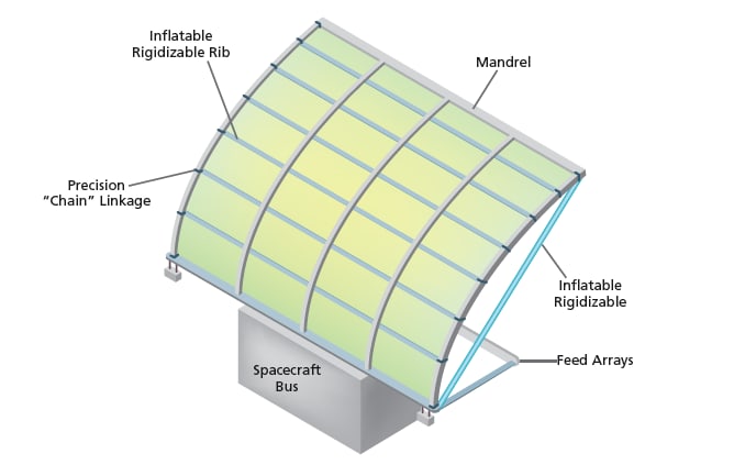 The cylindrical reflector with offset linear array feeds reduces the complexity from "N×N" transmit/receive (T/R) modules of a conventional planar-phased array to just "N" T/R modules. The antenna uses T/R modules with electronic phase-shifters for beam steering. The offset reflector does not provide poor cross-polarization like a double-curved offset reflector would, and it allows the wide scan angle in one plane required by the mission. Also, the cylindrical reflector with two linear array feeds provides dual-frequency performance with a single, shared aperture. The aperture comprises a reflective surface with a focal length of 1.89 m and is made from aluminized Kapton film. The reflective surface is of uniform thickness in the range of a few thousandths of an inch and is attached to the chain-link support structure via an adjustable suspension system. The film aperture rolls up, together with the chain-link structure, for launch and can be deployed in space by the deployment of the chain-link structure.