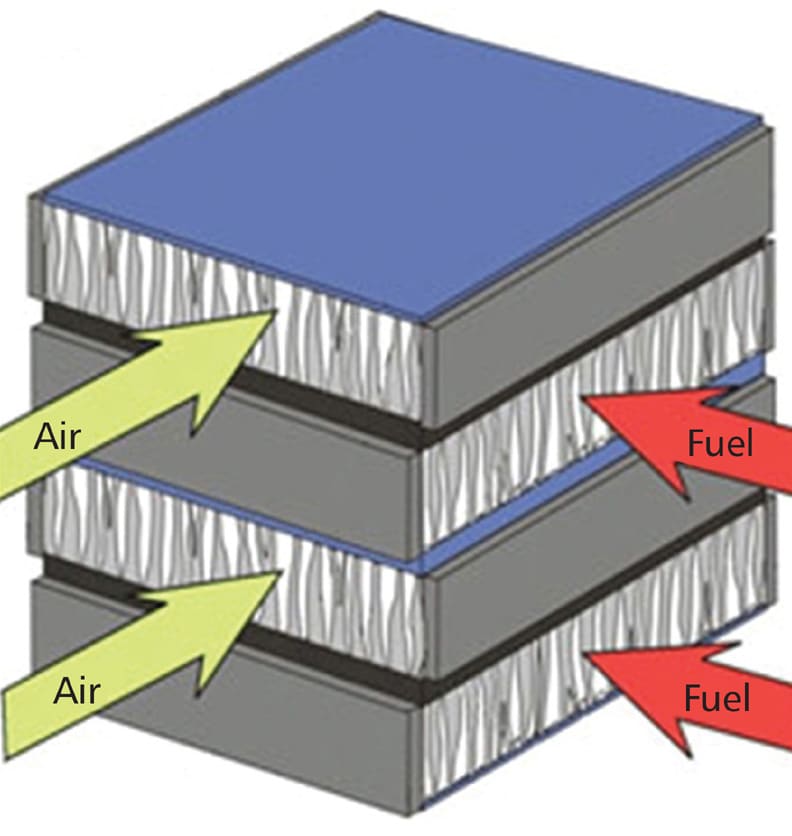 This design is highly versatile. The anode-impregnated material can easily be changed to nearly any metal such as tin or copper without any modification to the BSC, allowing for thinner layers and better performance characteristics. Also, since the BSC cells are fabricated entirely from ceramic materials, they can operate at higher temperatures, and the formation of hermetic, ceramic-to-ceramic seals is possible. The result is a BSC SOFC that can achieve high specific power densities that are five times higher than state-of-the-art (up to 2.5kW/kg), and a volumetric power density that is eight times higher than state-of-the-art (up to 7.5kW/L).