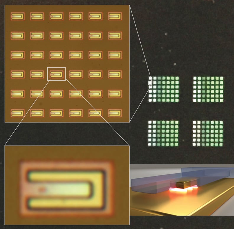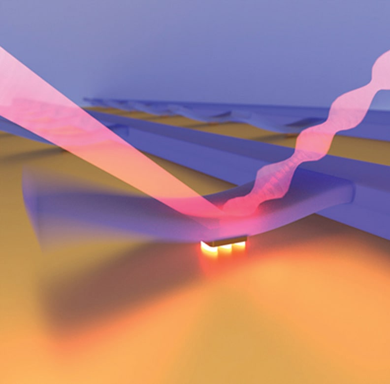 To use the motion-sensing technique in a practical device, the gold nanoparticle was embedded in a microscopic-scale mechanical structure — a vibrating cantilever — a few micrometers long, made of silicon nitride. Even when they're not set in motion, such devices never sit perfectly still, but vibrate at high frequency, jostled by the random motion of their molecules at room temperature. Even though the amplitude of the vibration was tiny — moving subatomic distances — it was easy to detect with the new plasmonic technique.