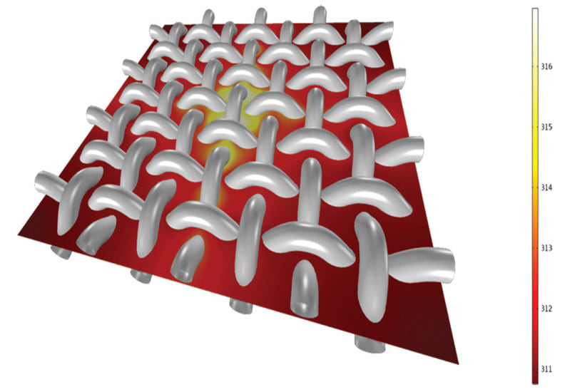 This type of thermal behavior is desired in applications where cooling needs to be provided laterally rather than through the thickness of the material; for example, to efficiently transport heat from electronic components in contact with the composite material. Modeling anisotropic materials in fibers is challenging and requires a coordinate system that “follows” the curved CAD geometry. Such a curvilinear modeling tool is included in COMSOL Multiphysics.