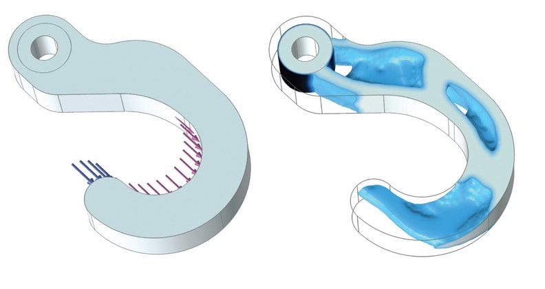 The topology optimization example in Figure 3 demonstrates how to obtain an optimal distribution of a fixed amount of material in a steel hook such that stiffness is maximized. Changing the amount of material available leads to a different solution that is also Pareto optimal, representing a different balance between the conflicting objectives.