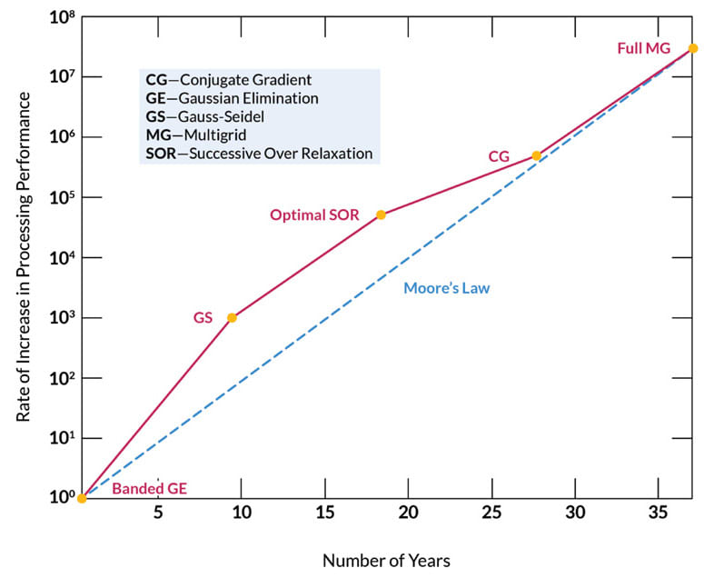 The graph in Figure 1 shows the rate of increase in processing performance over the number of years. Note that the vertical axis is logarithmic scale. From 1968 to 2005, the combined rate of performance increased a mind-boggling 1014. Both Moore's Law and the improvement of numerical algorithms have kept improving since 2005 — the reason we are at this point in history when so many previously out-of-reach problems can be solved.