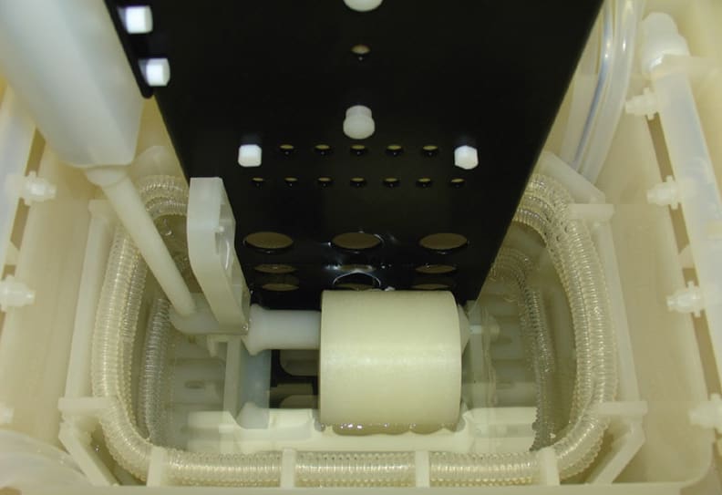 Attention should also be given to optimizing the orientation of the part if it has blind holes or other geometric features facing up that can hold chemistry when lifted out. The same holes, if horizontal, can create unwanted bubbles or air pockets. For these reasons, it might be necessary to design a solution that orients the part in a certain direction and then rotates it later in the process. Even if no blind holes are involved, etching the entire surface of a part may require rotating the part while minimizing contact with the surface.