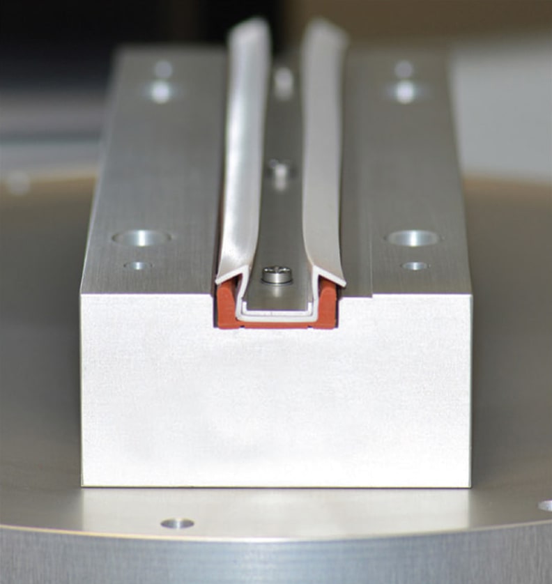 The shroud is typically composed of an elastomer material to allow for flexibility (which is essential to retraction), but it can also be made from thin metal or plastic materials. When the seal is no longer in use, a pair of V-shaped shroud “arms” extend upward from the base of the seal to cover the wall(s). A thin metal retainer is installed on top of the shroud, and fasteners pass through holes in the retainer, shroud, and sealing elements to secure the system to the base of the sealing groove. Metal washers are installed in these holes to provide a load path between the metal retainer and the surface of the sealing groove.