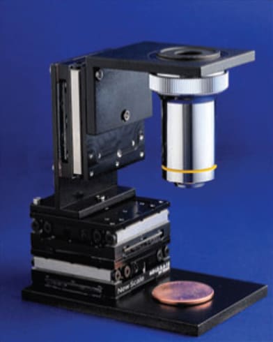 New Scale Technologies (Victor, NY) introduced the M3-LS-3.4 Linear Smart Stage, a compact linear positioning stage targeting embedded microscopes in automated instruments for 3D imaging, microelectronics inspection, and other applications where small size and high precision are essential. The stage has all control electronics embedded inside the stage. No external controller is needed; the controller accepts high-level motion commands via direct digital interface. No internal high voltage is needed or generated, and all positions are held with zero power and high stiffness. Closed-loop stepping uses an absolute position sensor inside the stage, with 0.5-micrometer resolution. The complete stage, including controller, measures 32 × 32 × 11 mm. The reduced-voltage piezoelectric microstage operates on 6 VDC and requires no high-voltage isolation.