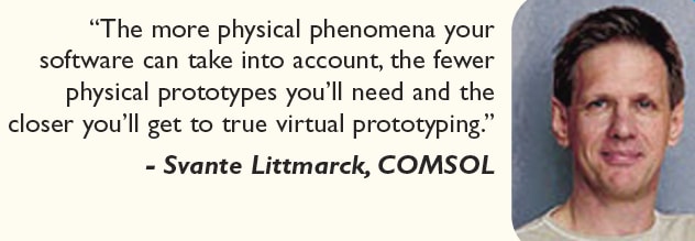 While virtual prototyping has its obvious benefits, it also requires more detailed data, extensive computing power, and of course, the right software. “Unless your software supports multiphysics modeling, you’re not going to be able to tackle problems in a realistic fashion,” according to Littmarck. “The more physical phenomena your software can take into account, the fewer physical prototypes you’ll need and the closer you’ll get to ‘true’ virtual prototyping.”